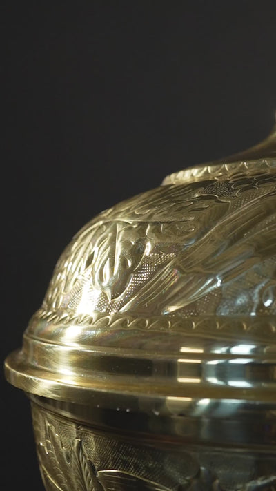 Chrzcielnica mosiężna wykonana z tłoczonej blachy mosiężnej, zdobiona motywami roślinnymi z symboliką winorośli.
