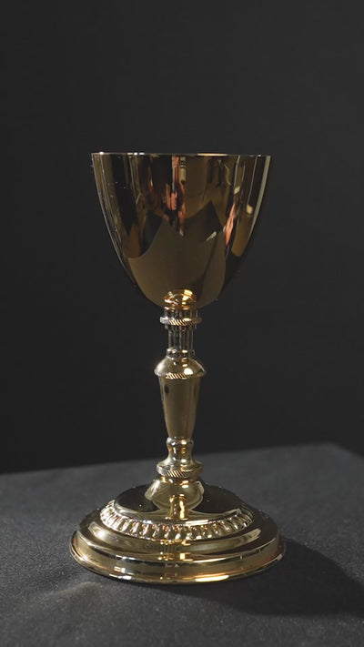 Kielich mosiężny wykonany z pozłacanej blachy mosiężnej, o klasycznej i eleganckiej formie.