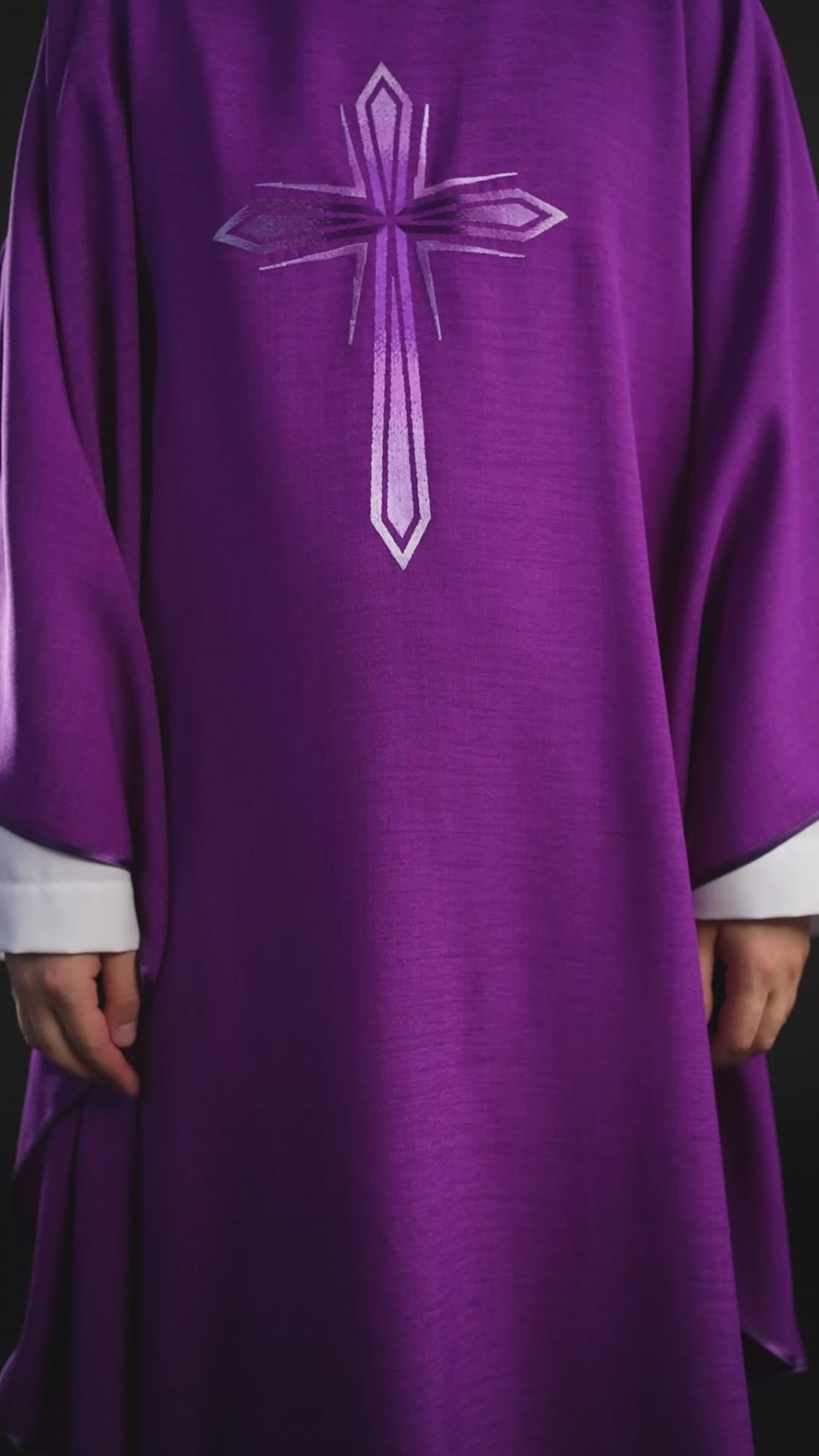 Ornat wykonany z wysokiej jakości tkaniny gładkiej, zdobiony haftowanym symbolem krzyża. Całość wykończona satynową lamówką w kolorze materiału. Dostępny we wszystkich kolorach liturgicznych. Wykończenie kołnierza typu golf. Stuła wewnętrzna w komplecie.