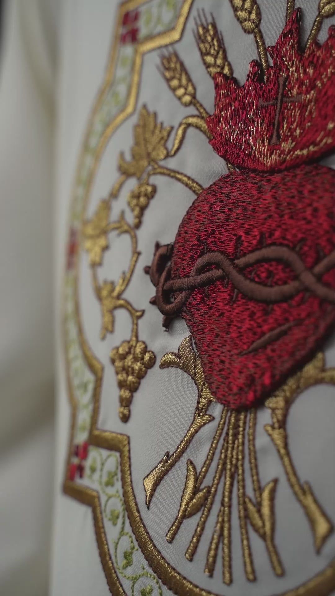 - Bogaty Haft: Ornat został bogato zdobiony haftem, który przedstawia symbol Sercem Pana Jezusa natomiast z tyłu ornatu został umieszczony motyw kielicha i hostii. Haft wykonany został złotymi i bordowymi nićmi, dodając ornatowi wyjątkowego blasku i głębi.