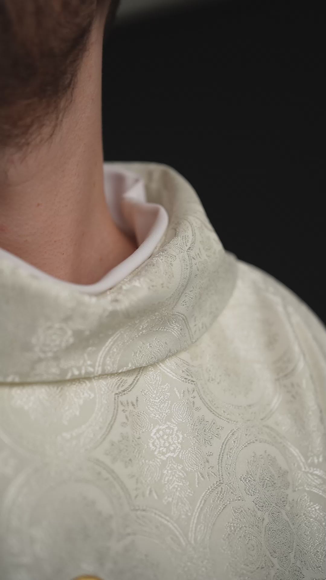 - Wykończenie Kołnierza Typu Golf: Zapewniające wygodę i elegancję podczas noszenia, wykończenie kołnierza typu golf stanowi dodatkowy element naszej szaty liturgicznej.