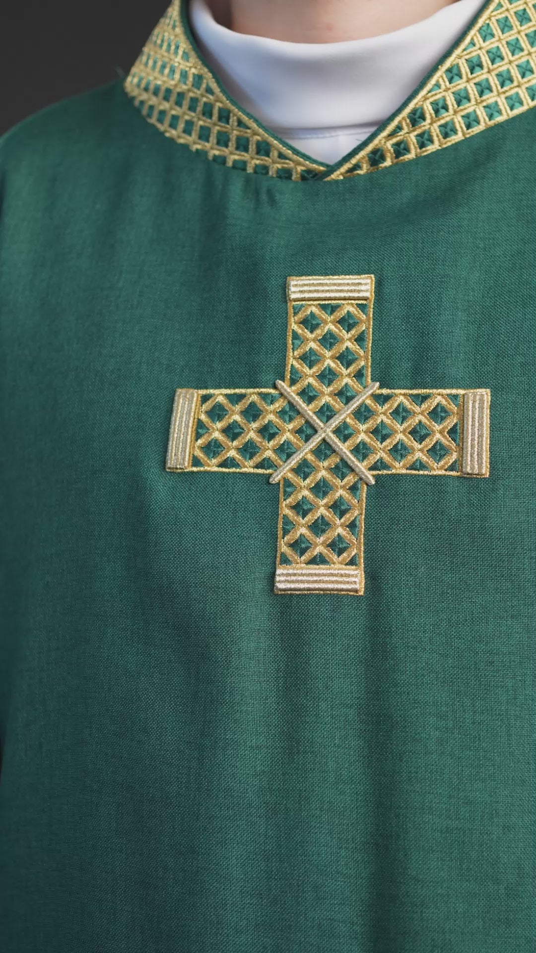 Nasz ornat, mistrzowsko wykonany z wysokiej jakości tkaniny, jest uosobieniem elegancji i głębokiego symbolizmu liturgicznego. Zdobiony w haftowane złote krzyże i kołnierz w kolorze zielonym, nasz ornat emanuje majestatem i pięknem.