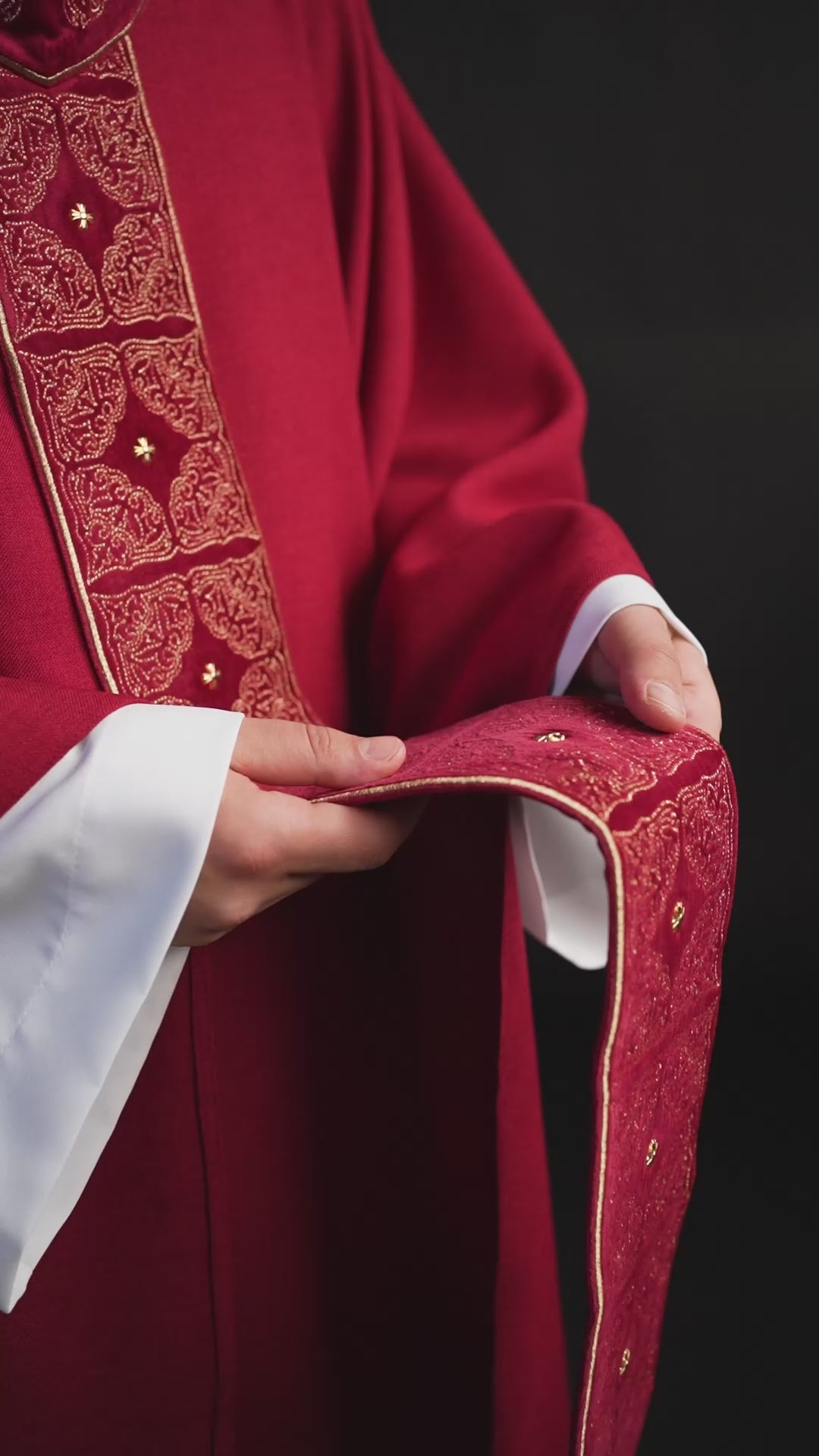 - Wykonany z wysokiej jakości tkaniny w kolorze czerwonym, która jest symbolem miłości, męczeństwa i królewskości. Tkanina jest przyjemna w dotyku i dobrze się układa, zapewniając komfort użytkowania podczas sprawowania kapłańskich posług.
