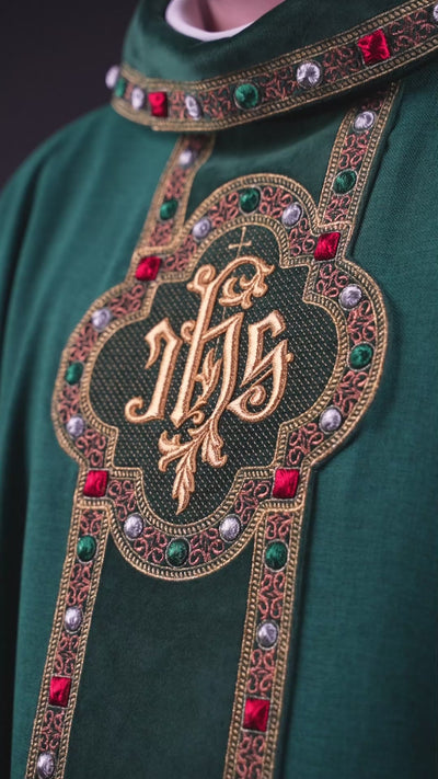 Ornat z bogato haftowanym pasem i lamówką wokół haft IHS I kołnierza w kolorze zielonym