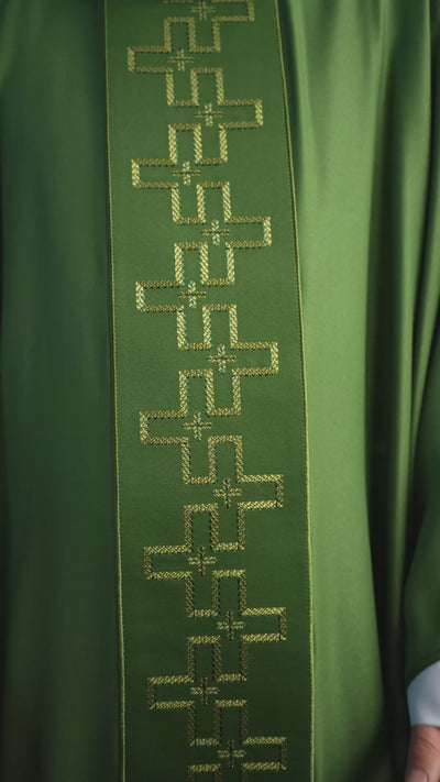Nasz ornat, mistrzowsko wykonany z wysokiej jakości tkaniny, jest uosobieniem elegancji i głębokiego symbolizmu liturgicznego. Zdobiony z bogato haftowanym pasem w haft krzyży w kolorze zielonym, nasz ornat emanuje majestatem i pięknem.