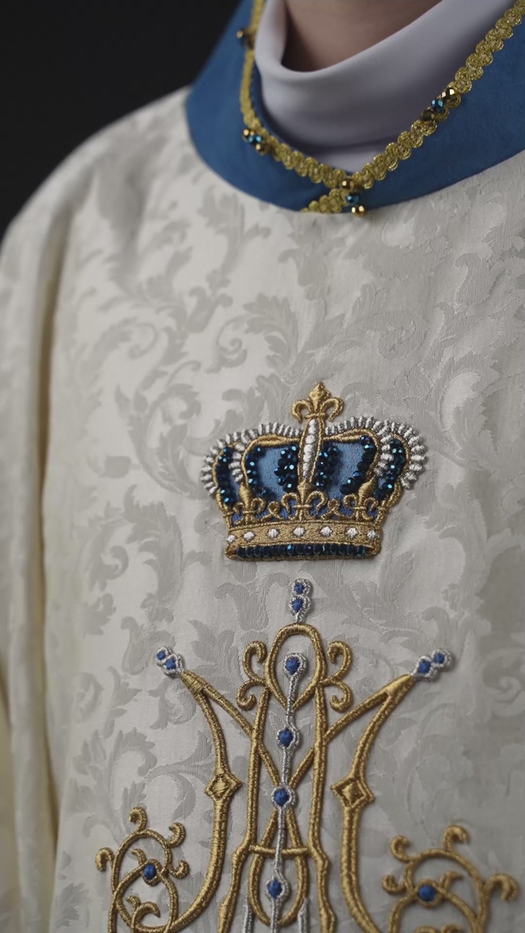 - Bogate zdobienia: Złote, włoskie taśmy podkreślają aksamitny, niebieski kołnierz oraz brzegi ornatu. Bogato haftowany symbol maryjny.