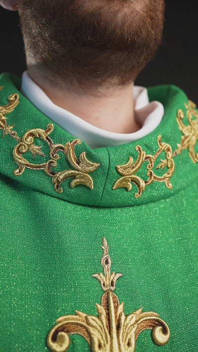Ornat wykonano za pomocą wysokiej jakości tkaniny, zdobionej haftem z symbolem eucharystycznym, wykonanym złotymi nićmi, który przedstawia motyw florystyczny. Dodatkowo brzegi ornatu wykończono satynową lamówką w kolorze ornatu, która idealnie komponuje się z wyhaftowanym na złoto motywem florystycznym z krzyżami. Ponadto, ornat dostępny jest we wszystkich kolorach liturgicznych.